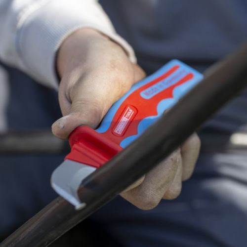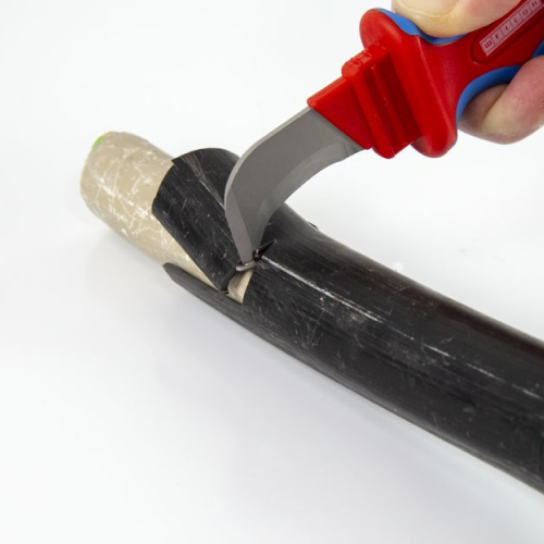 - Уникальная направляющая пятка для максимальной стабильности: Специальный упор гарантирует точное ведение ножа по кабелю, предотвращая соскальзывание и обеспечивая ровный продольный разрез даже на бронированных оболочках.