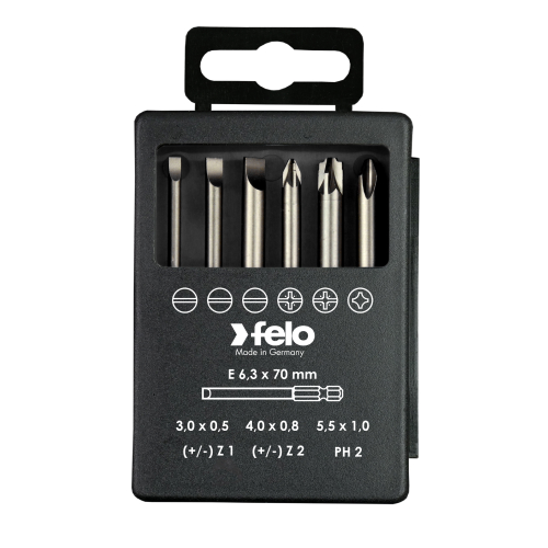Набор бит Felo SL/Z (+/-) Industrial 70 мм, 6 шт (03192716) — это надежный и высококачественный комплект для монтажных и ремонтных работ. В наборе представлены биты, предназначенные для работы с электрощитами и различными типами крепежа. Биты изготовлены из высококачественной инструментальной стали CrMoV, закалённой в масле, что обеспечивает их долговечность и износостойкость.