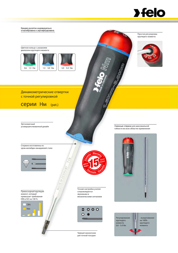 Рукоятка динамометрическая Felo NM 1,5-3,0 Нм, 10000206 — это профессиональный инструмент, предназначенный для точных работ, требующих контроля усилия затяжки. Пределы допускаемой относительной погрешности воспроизведений крутящего момента силы, % - ±3,0