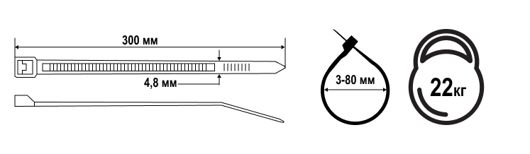 | Размер, мм4,8*300 | Диаметр охвата, мм3-80 | Разрывная нагрузка, кг22 |