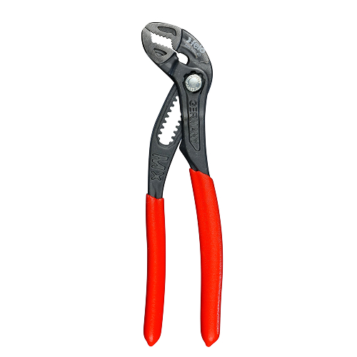 Стабильное сцепление с поверхностями обеспечивается зубчатой формой губок, предотвращающей соскальзывание. Корпус клещей выполнен из высококачественной хромованадиевой стали, прошедшей закалку в масле для повышенной прочности и износостойкости. Пластиковые рукоятки обеспечивают надёжный и удобный захват, повышая безопасность при работе.