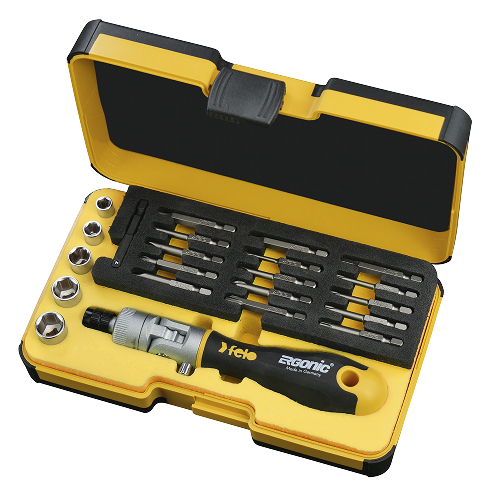 Набор Felo содержит 15 бит, 5 торцевых головок, переходник (адаптер) на головки и поворотную на 180° трещотку ERGONIC K.